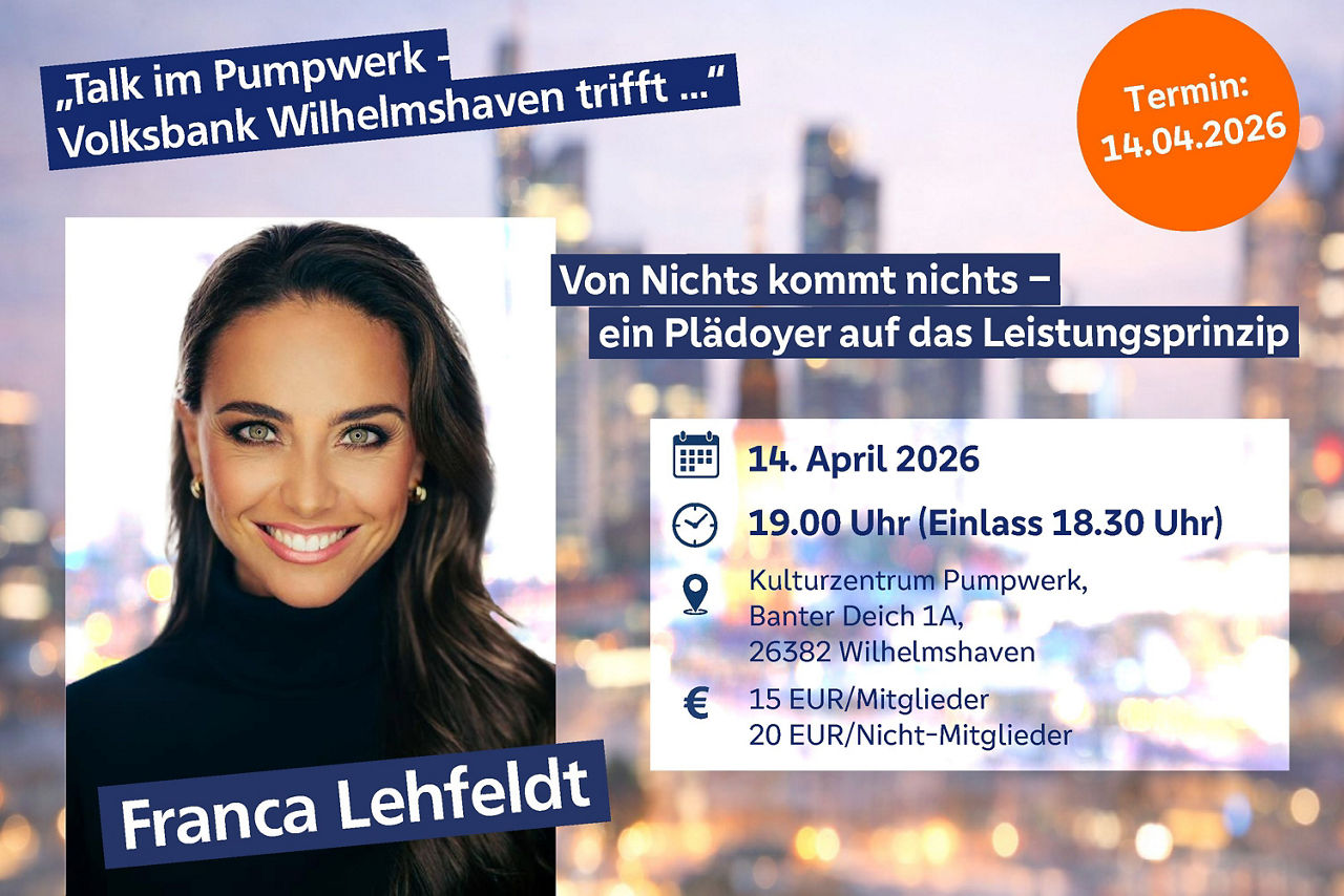 Die Volksbank Wilhelmshaven lädt herzlich zum Talk im Pumpwerk ein – einer Veranstaltungsreihe, die wirtschaftliche Themen, gesellschaftliche Fragen und unternehmerische Perspektiven miteinander verbindet. 2026 freuen wir uns auf Franca Lehfeldt als Gastrednerin im Kulturzentrum Pumpwerk.
